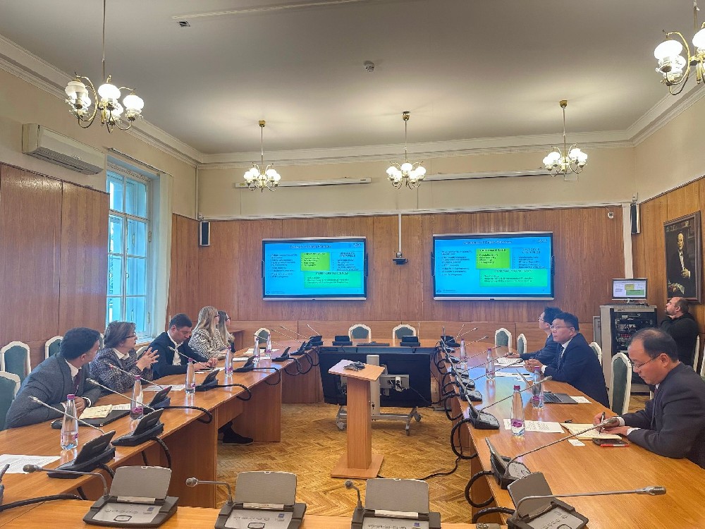 在莫斯科国立大学,代表团与国际发展部主任Igor P. Bochkov进行会谈。Igor P. Bochkov对代表团一行来访致以热烈欢迎,并介绍了莫斯科国立大学的历史沿革、办学特色、专业设置与国际化发展情况。希望与学校在环境科学与工程、土木工程、地球科学与工程等相关学科领域拓展学术交流与人才培养。