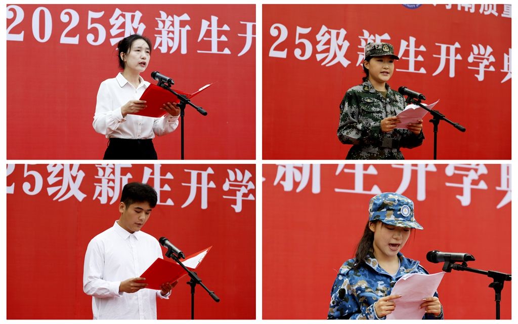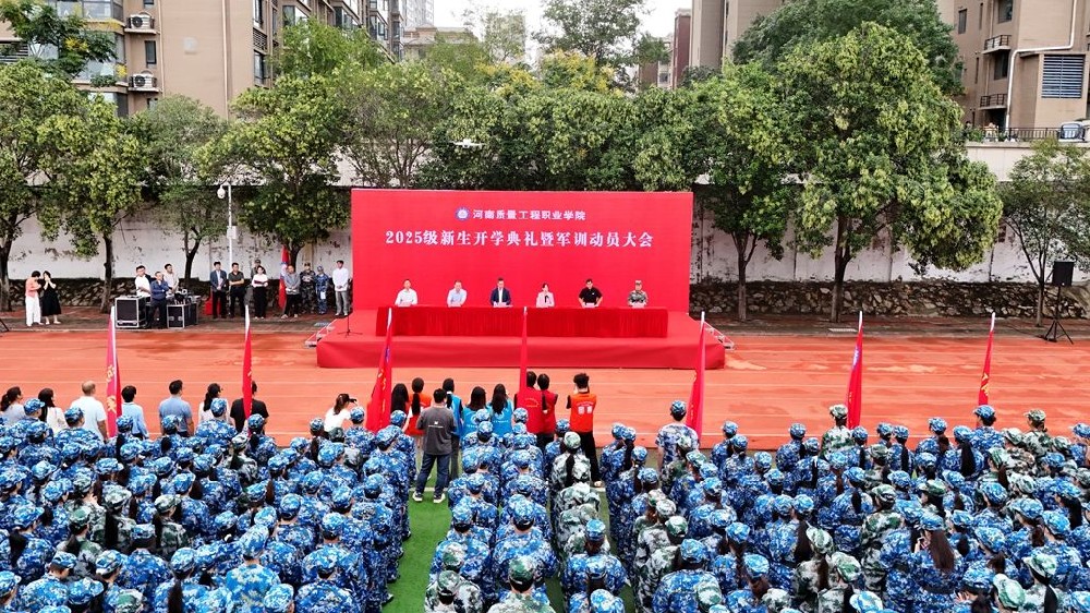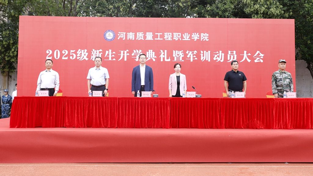 9月9日上午,河南质量工程职业学院分别在校本部、舞钢校区同时举行2025级新生开学典礼暨军训动员大会。校领导鲁书喜、金铮、席会平、张留成出席大会,学校各相关职能部门、二级学院负责人,教师代表和全体新生参加大会。校本部大会由副校长席会平主持。