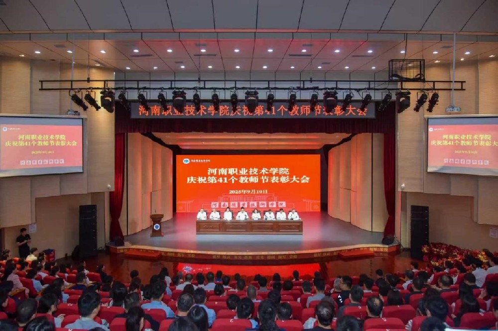 9月10日上午,河南职业技术学院在音乐厅隆重召开庆祝第41个教师节表彰大会,表彰为学校发展作出贡献的先进集体和个人,并向全体教职员工致以节日问候和崇高敬意。校领导厉励、夏新颜、肖珑、李玉峰、盛兴文、任枫轩、鲁冬出席会议。学校副科级及以上干部、受表彰教师代表及部分师生代表参加会议。校党委委员、副校长朱永宽主持会议。