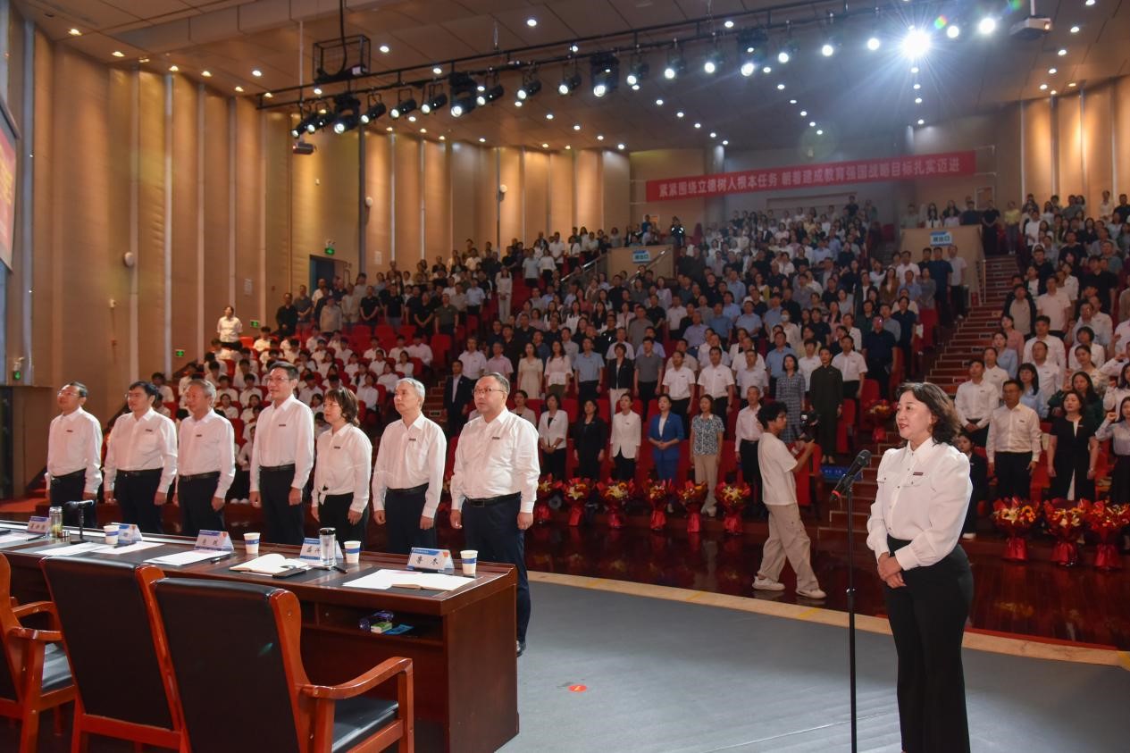 会上,校党委委员、副校长李玉峰宣读了河南省2025年优秀教师、2024年度河南省事业单位人员定期奖励“记功”教师、2022-2024年突出贡献人员、光荣从教30年教师、2024-2025年度“三育人”先进个人的相关表彰文件。校领导厉励、夏新颜、肖珑分别为受表彰教师颁发荣誉证书和纪念奖牌。刘拥军、王利琴、张一宁、童俊艳、王蕊等五位教师代表,结合自身工作成长经历,从科研创新、教书育人、管理服务等方面分享了心得体会;学生代表史文琪围绕自身求学经历表达了对师长关怀的感恩之情。随后,校党委副书记、校长夏新颜带领与会全体教职员工重温教师誓词,进一步坚定职业信念,增强责任感、使命感与荣誉感。