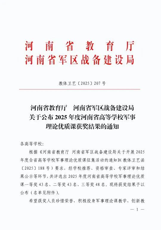 近日,河南省教育厅、河南省军区战备建设局公布了2025年度全省高等学校军事理论优质课获奖名单,开封大学信息工程学院教师李洁讲授的课例《铸造护国利剑开创强军伟业——国防建设(二)》荣获一等奖。