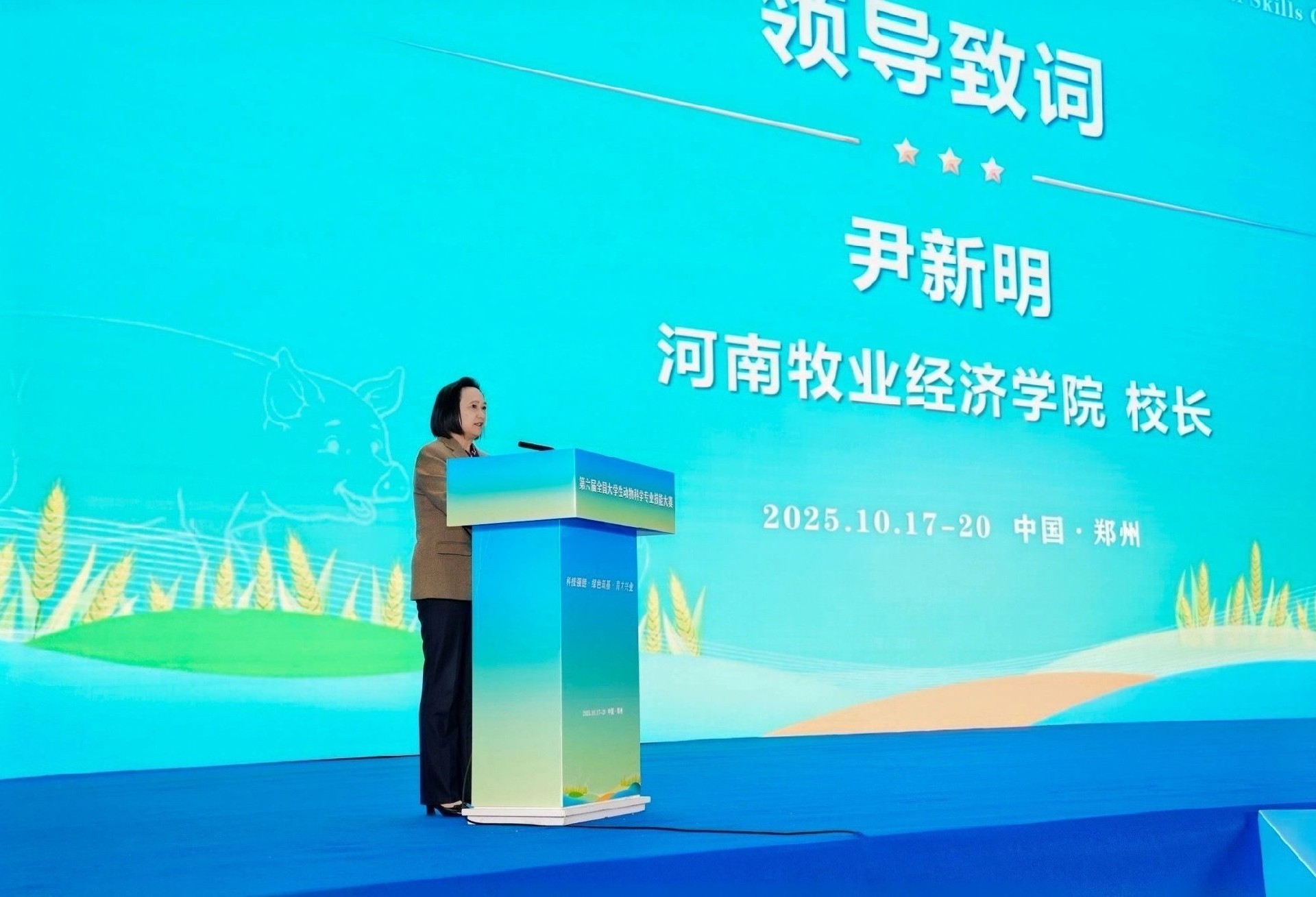 尹新明在开幕式致辞中对莅临本次大赛的各位领导、嘉宾、企业代表以及全体参赛师生表示热烈欢迎。她指出,学校始终坚持以立德树人为根本,以强农兴农为己任,坚持农科攀峰、工科强链、商科惟用,走牧工商一体化多学科交叉融合创新发展之路。动物科学专业是学校首批本科专业,培养了一大批奋战在教学、科研、生产第一线上的优秀人才,为河南省乃至中国畜牧业的蓬勃发展作出了卓越贡献。长期以来,学校高度重视实践育人工作,希望以本次大赛为平台,进一步加强参赛各方的交流与合作,营造全社会关心支持动物科学专业人才培养的良好氛围;希望以本次大赛为契机,加强产教融合,推动高校与社会力量的协同,把农业科技进步的前沿要求和产业发展的实际需求,始终贯穿在人才培养全过程;希望以本次大赛为引领,服务国家重大战略需求,共同推动畜牧学科高质量发展,为农业强省和教育强国贡献力量。