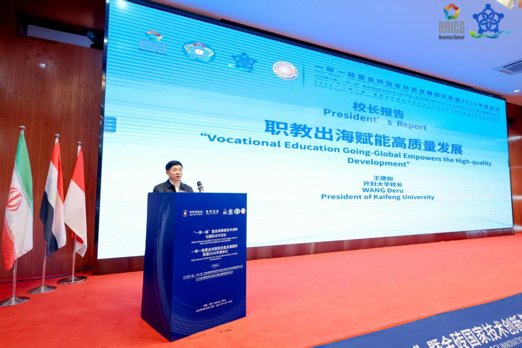 凭借在技能发展与国际职教合作领域的突出贡献,开封大学校长王德如受邀出席,并获聘2026 “一带一路”暨金砖国家技能发展与技术创新大赛主席团成员。论坛上,王德如作了题为“职教出海赋能高质量发展”的校长报告,系统分享了开封大学服务国家战略、推动职业教育国际化的实践探索与标志性成果,为中非及“一带一路” 沿线国家职教合作提供可复制经验。论坛期间,王德如还作为颁奖嘉宾,为2025“一带一路”暨金砖国家技能发展与技术创新大赛优秀仲裁获奖者颁发证书,勉励他们坚守公平公正、专业精进的竞赛精神,助力技能人才培养与国际交流。