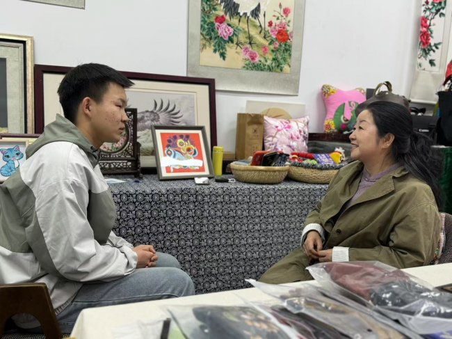 随后,团队前往吴忠市巧儿刺绣坊,与国家级非物质文化遗产代表性传承人(民间绣活·宁夏刺绣)李夏音开展深入交流。作为宁夏刺绣传承的核心力量,李夏音详细介绍了巧儿刺绣融合回族文化与民间工艺的独特风格,现场展示了多款精美绣品,细致讲解了平绣、盘绣、掇绣等传统针法的技艺精髓,同时分享了非遗工坊在带动妇女就业、推动非遗进校园、助力乡村振兴等方面的实践经验,展现了非遗技艺在当代生活中的创新活力与时代价值。团队成员主动参与动手体验,在一针一线的操作中,感受宁夏刺绣的细腻雅致,深入了解非遗技艺的当代转化路径。