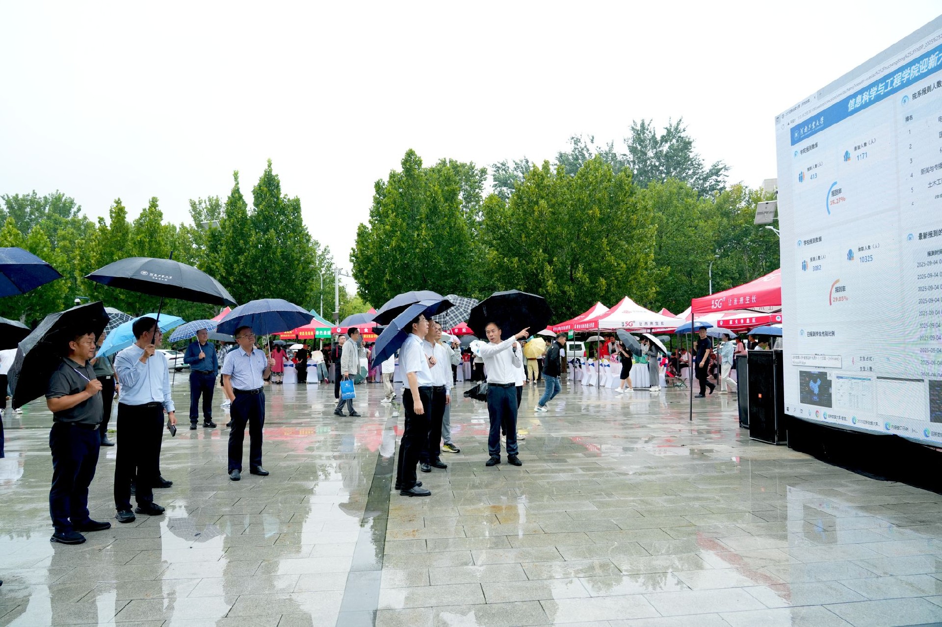 两个校区矗立着迎新大屏,实时显示着各校区的报到人数、生源地报到数据等信息动态。各学院迎新展位整齐排列,不仅是迎新的服务站点,更成了展示学科风采、传递学院文化的生动窗口。受天气影响,有的学院将迎新地点设置在室内,并为新生家长设置休息区。迎新志愿者来回穿梭于学校的各个角落,运送行李、耐心引导、答疑解惑,同手持录取通知书的新生们交织成校园里最亮丽的风景线。