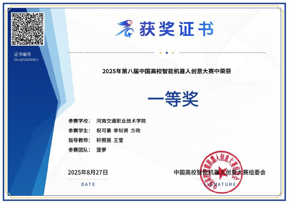 近日,第八届中国高校智能机器人创意大赛全国总决赛成绩揭晓。河南交通职业技术学院汽车学院祝可豪、李钊贤、方政三位同学组成的参赛队伍,在轩照振、王莹老师两位老师指导下,经过省赛选拔进入全国总决赛,并荣获一等奖。
