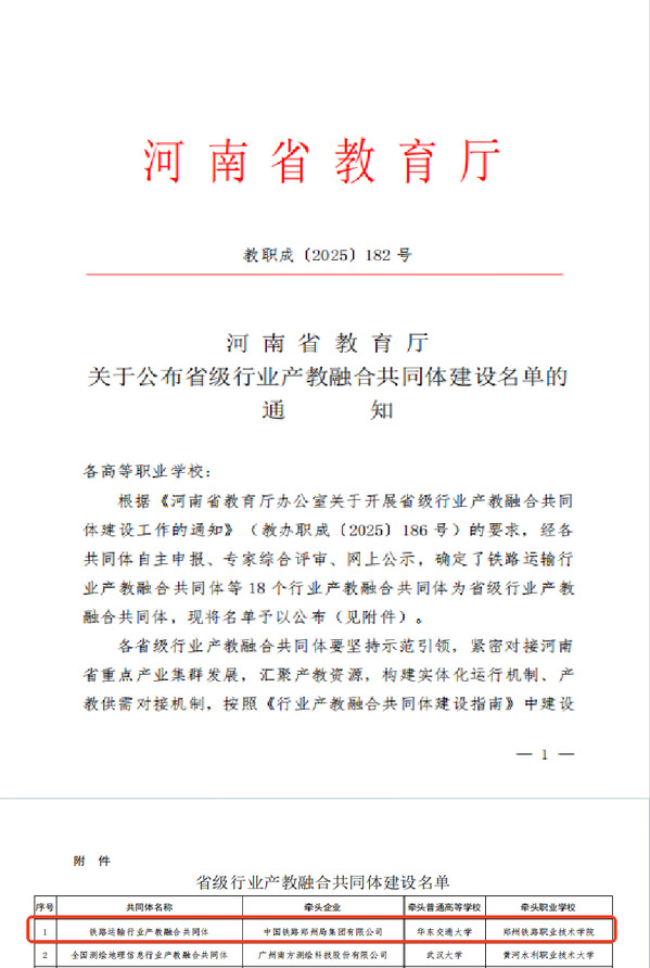 近日,河南省教育厅发布《关于公布省级行业产教融合共同体建设名单的通知》(教职成〔2025〕182号),正式确定了18个省级行业产教融合共同体。由郑州铁路职业技术学院牵头的铁路运输行业产教融合共同体成功入选,标志着学校在产教融合方面迈出重要一步。