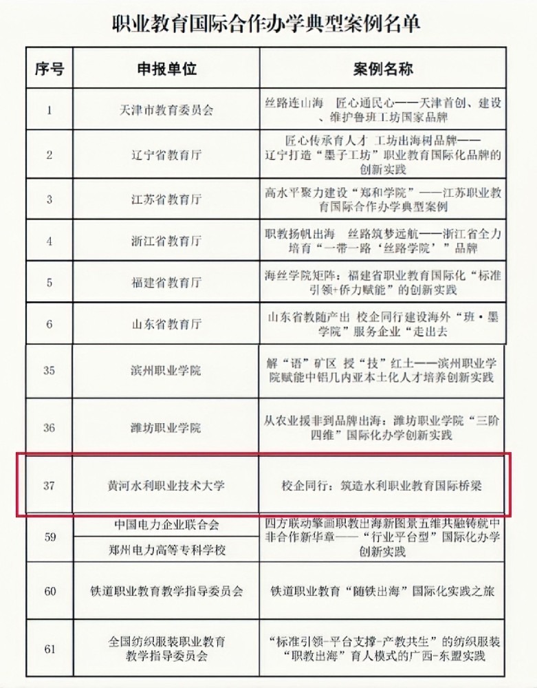 近日,中国教育国际交流协会受教育部职业教育与成人教育司委托,正式公布了“职业教育国际合作办学典型案例”遴选结果。经全国范围征集与专家评审,共遴选产生61个优秀案例。黄河水利职业技术大学申报的《校企同行:筑造水利职业教育国际桥梁》案例成功入选。