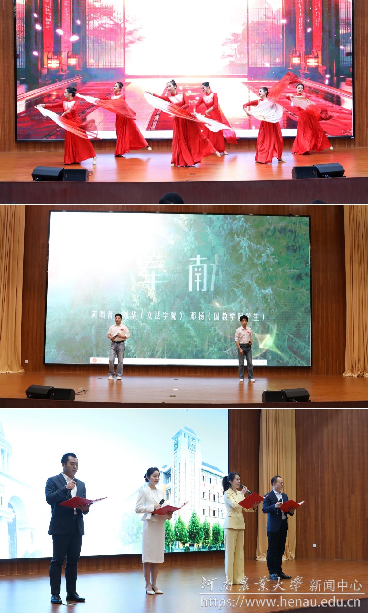 与会人员共同观看了学校宣传片《追光》。来自农学院、经济与管理学院、文法学院、外国语学院、体育学院、国际教育学院、附属中学的新老教职工和学生代表表演了舞蹈《光亮》、歌曲《奉献》、诗朗诵《薪火长明 强农有我》等节目,充分展现了农大师生昂扬向上的精神风貌和喜迎新同事的浓厚氛围。