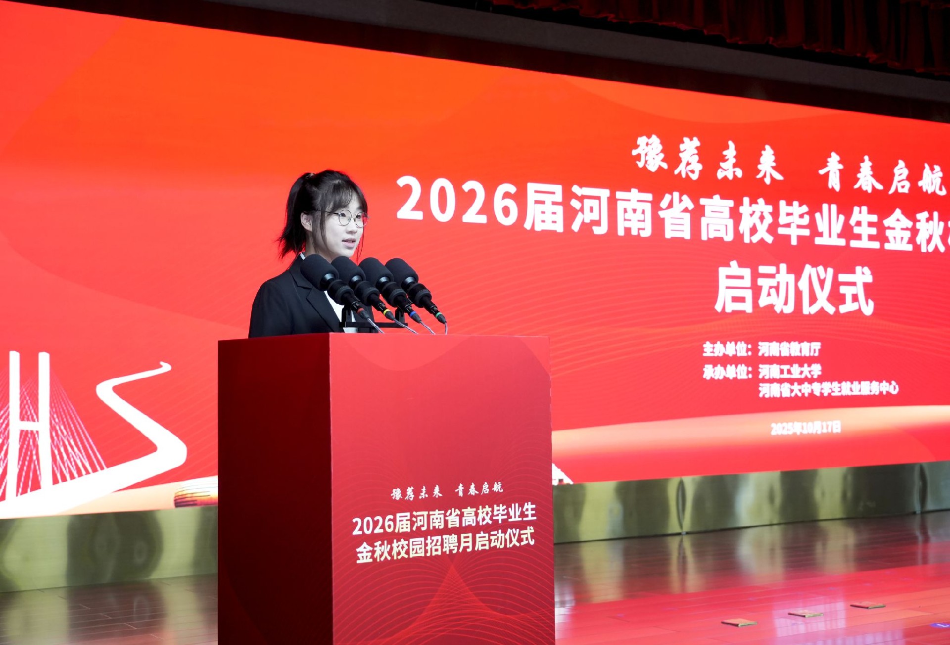 近日,2026届河南省高校毕业生金秋校园招聘月启动仪式暨秋季校园双选会在河南工业大学举办。省教育厅、省发改委、省工信厅、省人社厅、省卫健委及河南工业大学领导出席启动仪式。省大中专学生就业服务中心相关负责同志,省人才交流中心相关负责同志,部分高校就业工作分管负责同志,省级分市场牵头高校、驻郑各普通高校就业部门负责同志,部分高校就业指导教研室主任、就业骨干教师,广大用人单位、毕业生代表参加启动仪式及相关活动。启动仪式由校党委副书记黄泽峰主持。