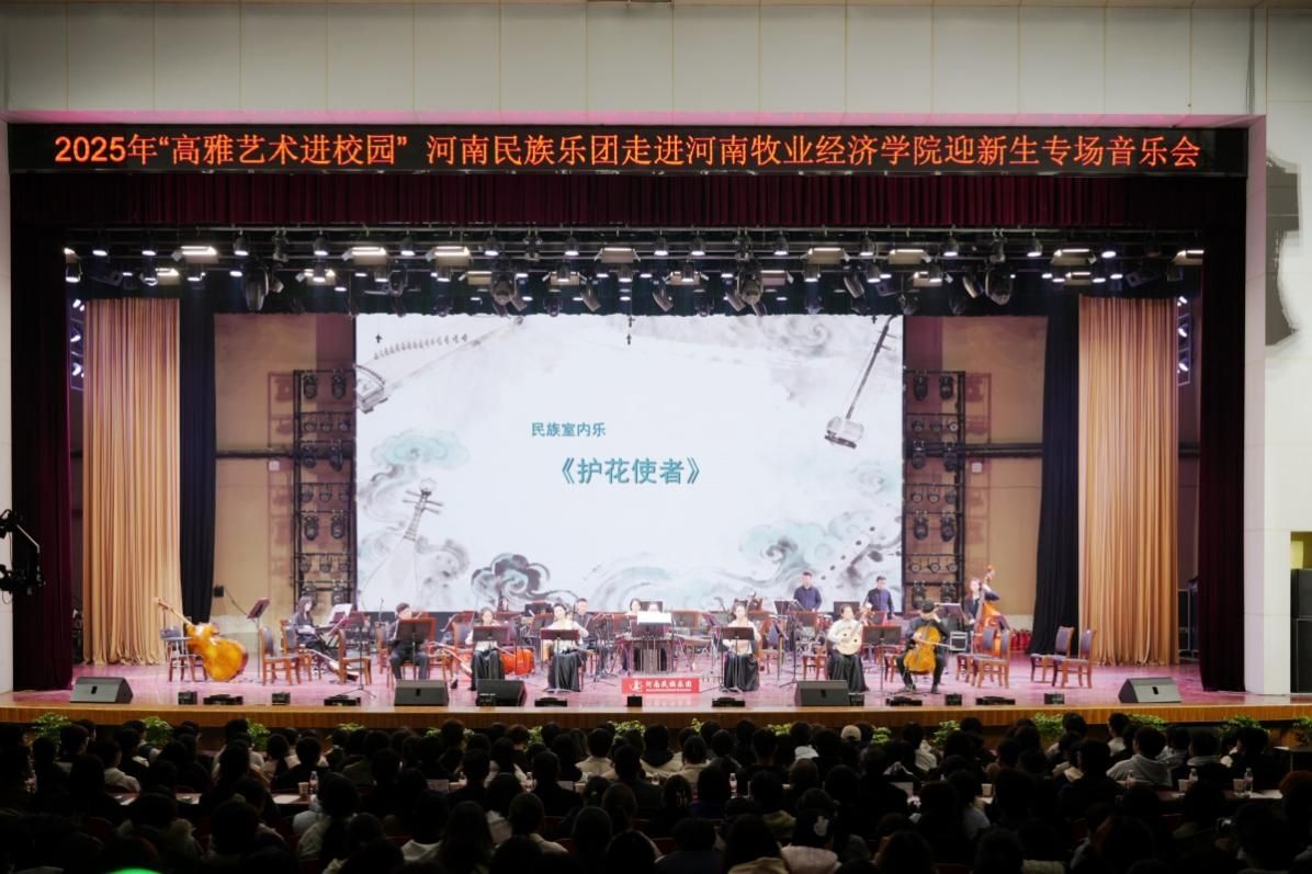 11月6日,一场由河南民族乐团带来的“走进河南牧业经济学院专场音乐会”在河南牧业经济学院英才校区大礼堂如期举行。演出采取线上线下相结合的方式呈现。河南省歌舞演艺集团总经理、党委副书记、副董事长朱辉,校党委书记刘志伟,校长尹新明,校党委副书记姚毅,副校长黄良杰等领导和1000多名新生代表现场观看了演出。