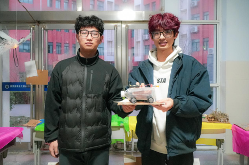 《废品逆袭王》作者王成龙同学表示:“本次作品利用废旧塑料瓶、闲置电机等废料,改造为一辆动力小车,其设计核心在于资源循环利用与科技创新的结合。以塑料瓶作为车身,闲置电机提供动力,塑料片裁剪成螺旋桨,通过机械组合使各类废品实现功能再生。这不仅解决了废旧物料的浪费问题,还通过物理动力原理的应用,将环保理念融入科创实践。在参与比赛的过程中,我们从拆解废料到组装调试,深刻体会到‘废品皆可利用’的真谛。这次实践不仅锻炼了我们的动手能力,更让我们认识到变废为宝是对资源的尊重,促使我们在生活中更加注重绿色低碳的践行,收获了满满的成就感与全新的环保认知。”