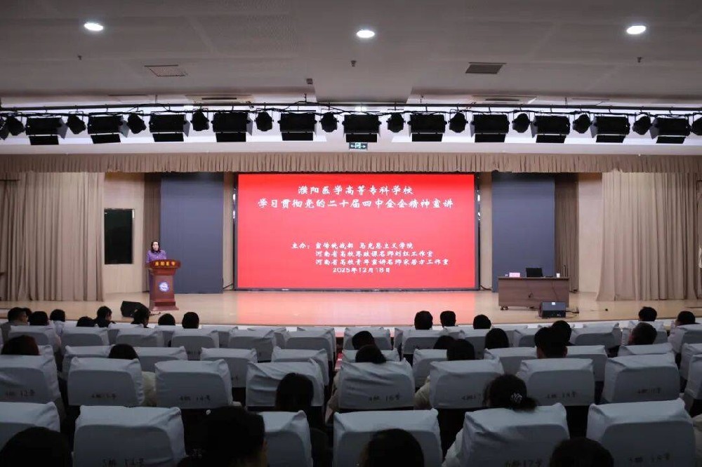 为深入学习贯彻党的二十届四中全会精神,引导全校师生深刻领会全会精神的核心要义与实践要求,统一思想、凝聚共识,12月18日,濮阳医学高等专科学校在易明楼报告厅举办学习贯彻党的二十届四中全会精神宣讲会暨党委理论学习中心组(扩大)会。在校领导班子成员出席。各部门负责人、总支(支部书记)、全体教职工党员、学生入党积极分子400余人参加。会议由党委副书记何美玲主持。