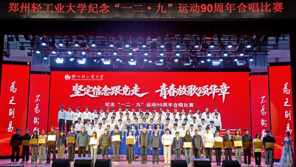 为纪念“一二·九”运动90周年,传承爱国精神,12月4日,郑州轻工业大学在东风校区大礼堂举办以“坚定信念跟党走 青春放歌颂华章”为主题的合唱比赛。全校18个学院的1600余名参赛师生齐聚一堂,用歌声抒发爱国情怀、礼赞时代华章。校党委副书记杨新宇、纪委书记顾兴良出席活动并颁奖,相关职能部门负责同志、各学院党委副书记、团委书记及700余名学生代表观看比赛。